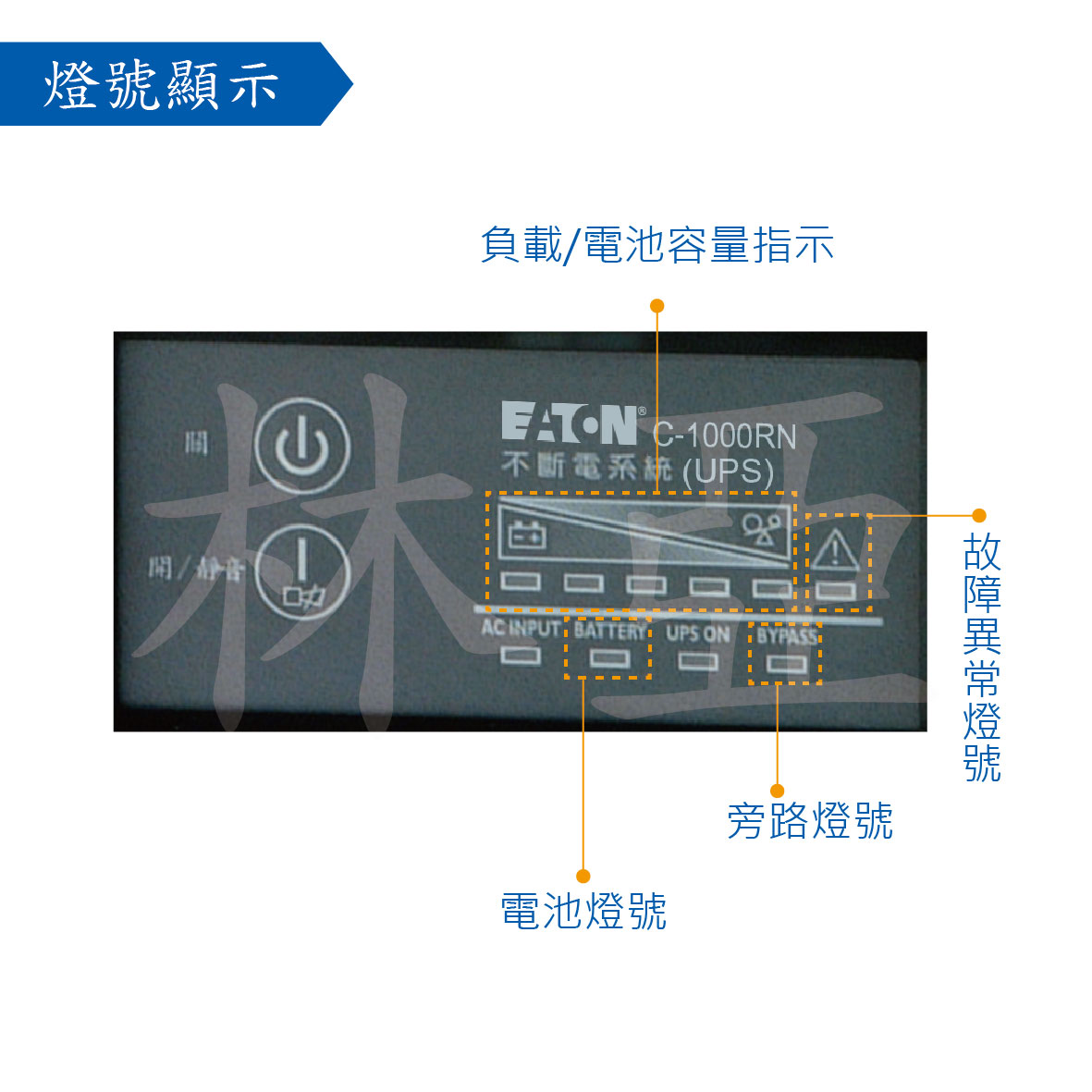 電力輸入正常(綠色),變流器正常(綠色),負載跳由旁路供電(橙色),異常(紅色),負載指示(5個LED顯示器),電池放電指示(橙色),放電電池容量指示(5個LED顯示器) |