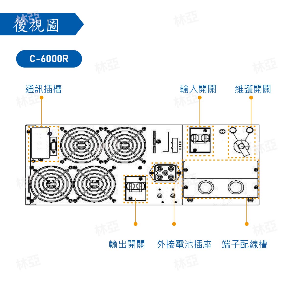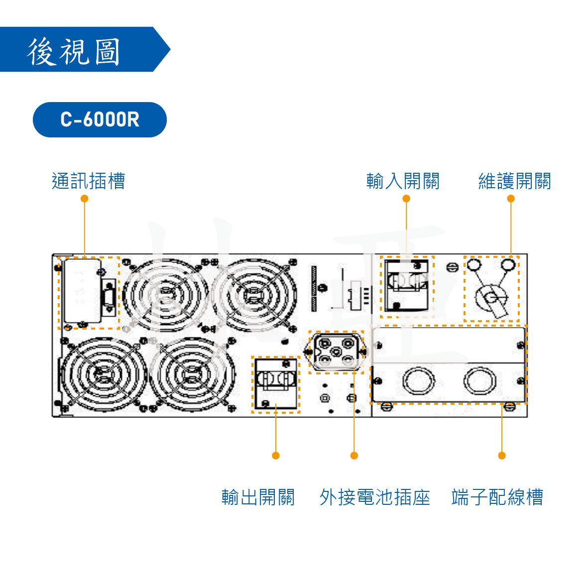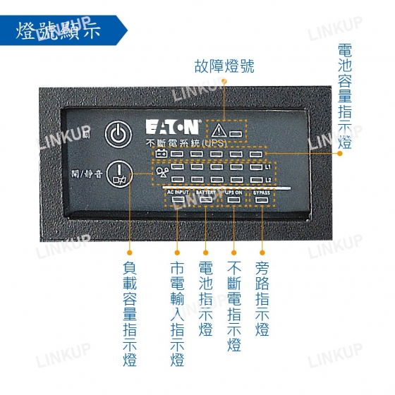 電力輸入正常(綠色),變流器正常(綠色),負載跳由旁路供電(橙色),異常(紅色),負載指示(5個LED顯示器),電池放電指示(橙色),放電電池容量指示(5個LED顯示器) |