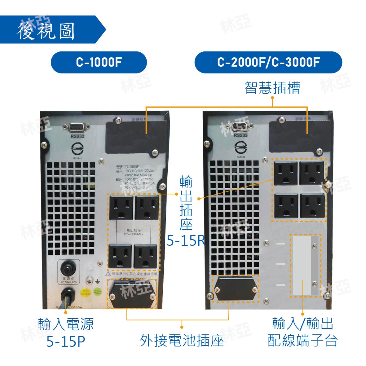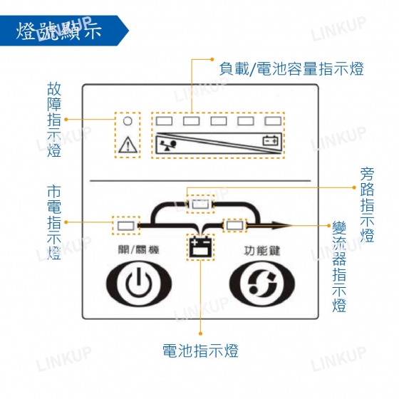 電力輸入正常(綠色),變流器正常(綠色),負載跳由旁路供電(橙色),異常(紅色),負載指示(5個LED顯示器),電池放電指示(橙色),放電電池容量指示(5個LED顯示器) |