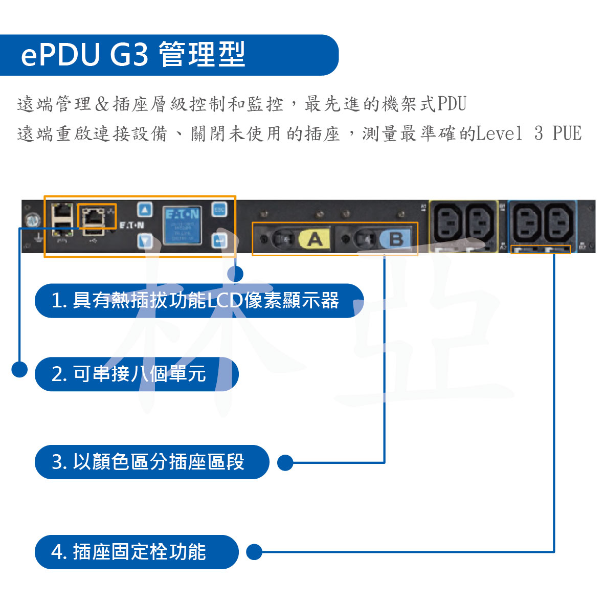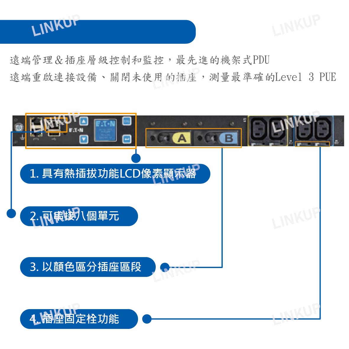伊頓管理型機架式 PDU (也稱為切換型 PDU) 可監測和控制關鍵因素,例如電壓、電流和功率因數。插座層級的相關資訊,可幫助您在資料中心的能耗方面做出正確的決定。伊頓管理型垂直和水平裝置是我們最先進的切換型 PDU,亦具備遠程開/關插座切換功能,可讓您重新啟動連接的設備。您還可以關閉未使用的插座,防止未經授權的使用。