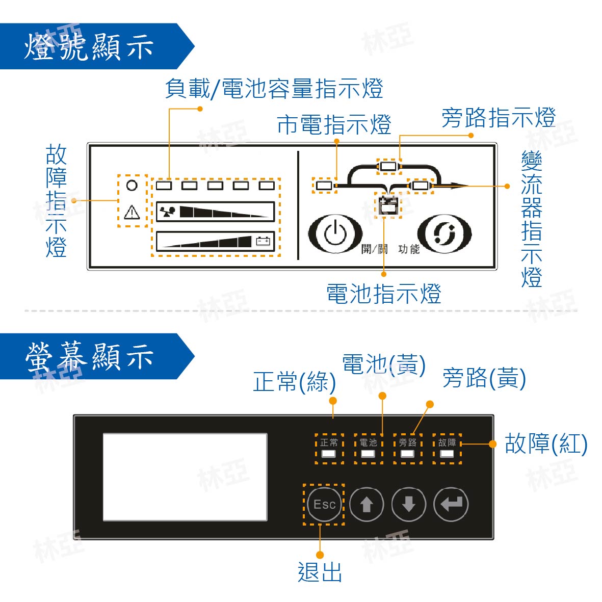 正常指示燈,電池指示燈,旁路指示燈,故障指示燈