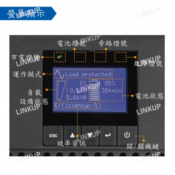 市電指示、電池放電指示、旁路供電、異常指示 |