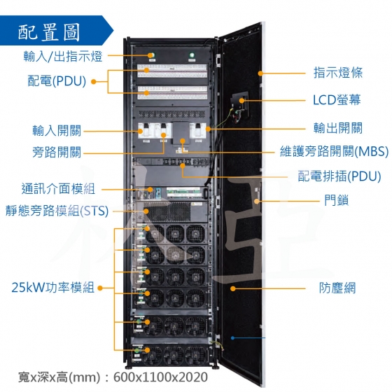 | 標準與認證 | IEC 62040-2、IEC 62040-1、IEC 62040-3、BSMI、消防認證 | |||