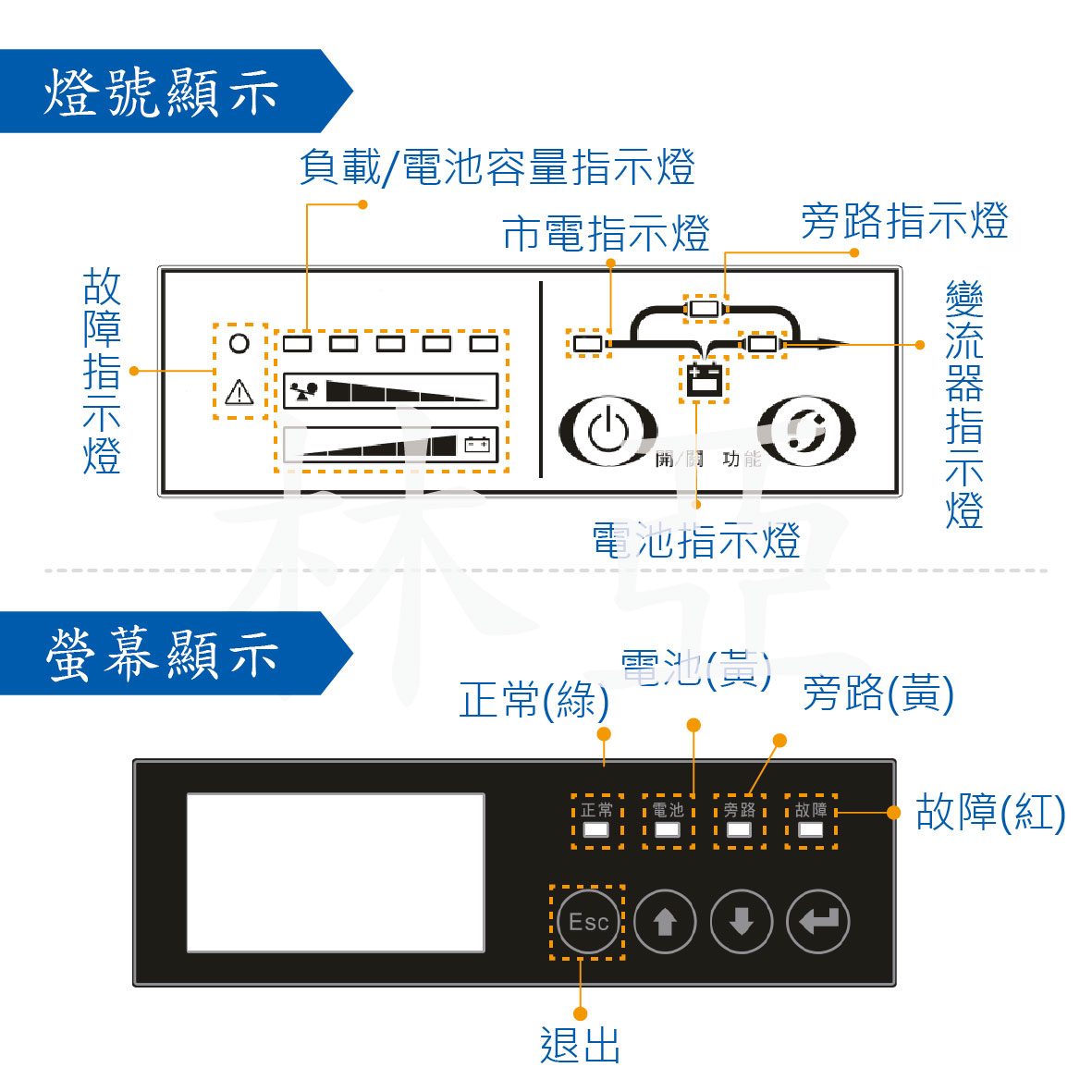 正常指示燈,電池指示燈,旁路指示燈,故障指示燈 |
