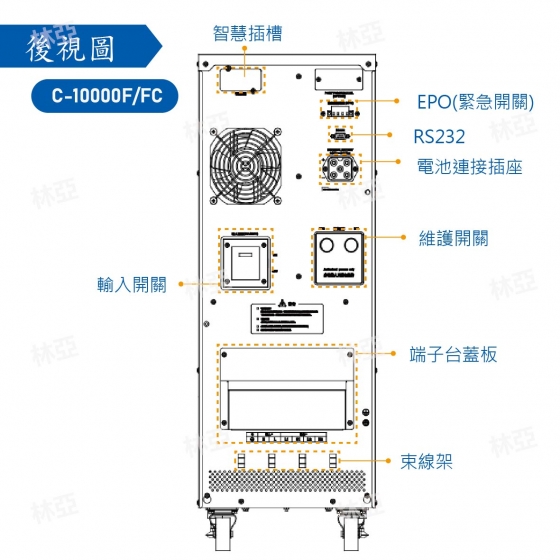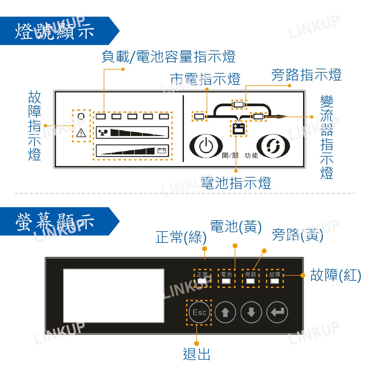 液晶中文顯示UPS狀態及操作指引,輸入電壓、頻率,輸出電壓、電流、頻率、輸出功率、電池電壓、電池容量、後備時間、故障與狀態顯示警告…等 |