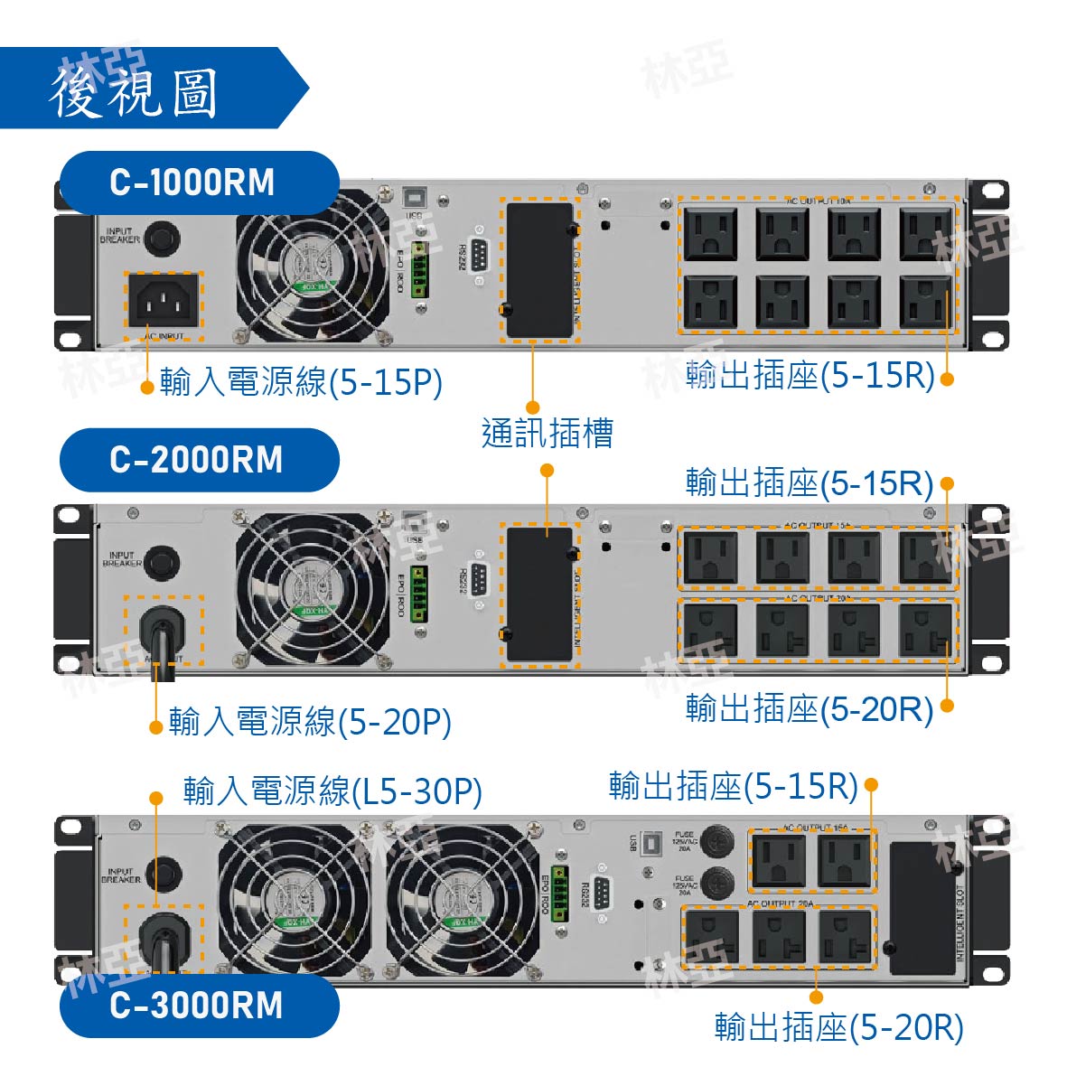 | 額定容量 | 1000VA / 900W | 2000VA / 1800W | 3000VA / 2700W | |