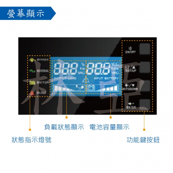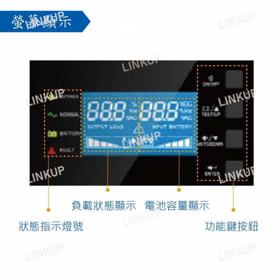 | 告警功能(LCD) | 電量過低 / 電池異常 / 超載 / 旁路異常 / 故障 | |||
